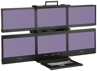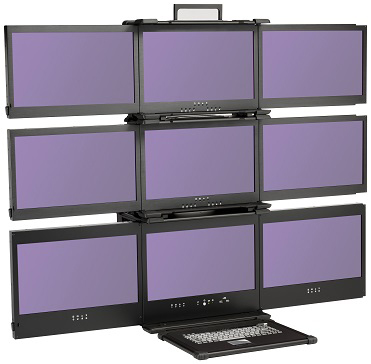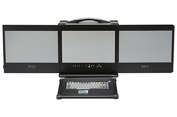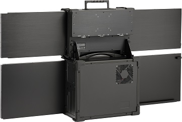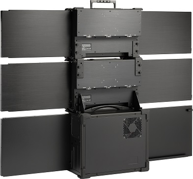 The Apollo-A5 offers a three screen portable pc unit with a standard atx format setup with shock mounted rubber corners and utilizes (3) 17.3" 1920x1080 HD resolution LCD displays. This unit also has an option for (6) 17.3" 1920x1080 HD resolution LCD displays or (9) 17.3" 1920x1080 HD resolution LCD displays